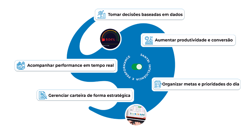 Metas, histórico, carteira e comportamento do cliente eliminam decisões no improviso.